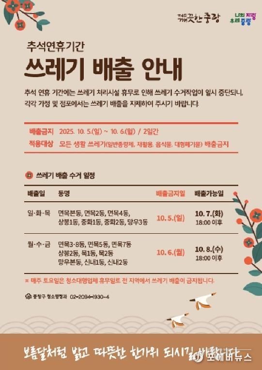 [ 포에버뉴스 김경순 기자 ] 중랑구는 다가오는 추석 연휴인 10월 3일부터 9일까지, 구민들이 건강하고 쾌적한 명절을 보낼 수 있도록 응급의료 서비스와 쓰레기 처리 대책을 동시에 추진한다.