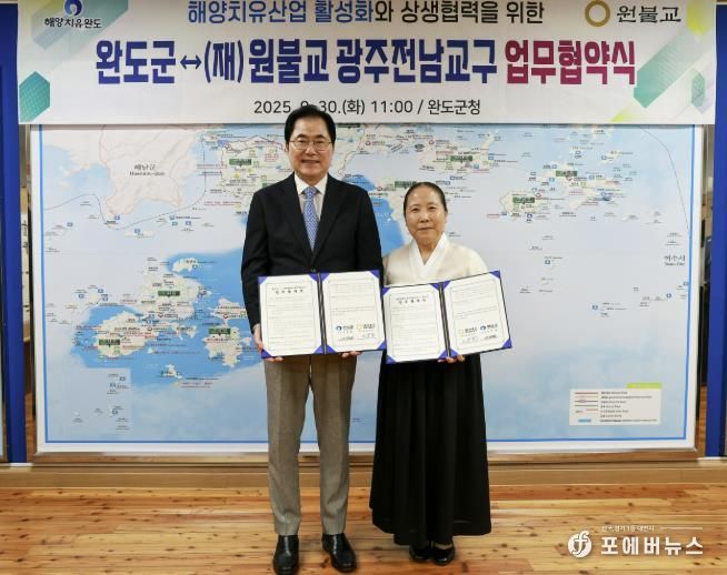 [ 포에버뉴스 오명숙 기자 ] 완도군이 완도 해양치유산업 활성화를 위해 (재)원불교 광주전남교구와 업무 협약을 체결했다.