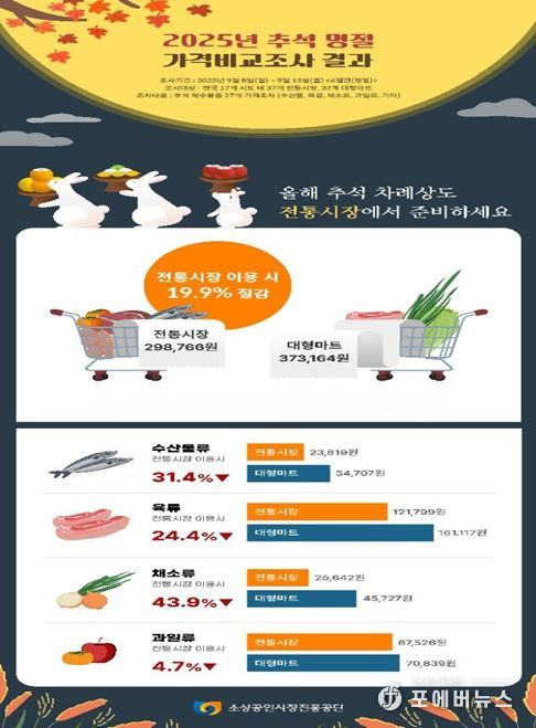 4인 기준 추석 차례상 준비 비용은 전통시장이 298,766원, 대형마트 373,164원으로, 전통시장이 대형마트에 비해 74,398원(19.9%) 저렴하며, 전체 27개 조사 품목 중 20개 품목이 전통시장에서 더 저렴한 것으로 조사됐다.