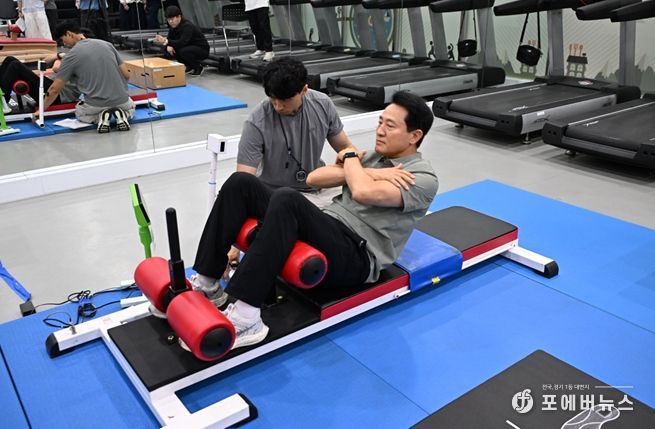 오 시장은 키‧몸무게, 체성분 검사 후 윗몸일으키기, 제자리멀리뛰기 등을 직접 해보며 근력, 근지구력, 유연성, 심폐지구력, 민첩성 및 순발력 등을 측정했다.