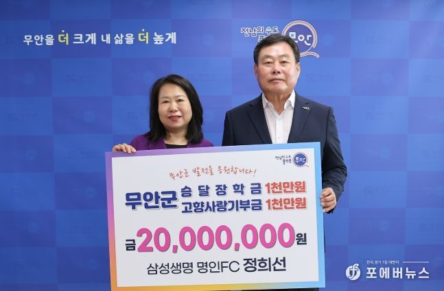 [ 포에버뉴스 오명숙 기자 ] 전남 무안군은 1일 삼성생명 정희선 명인FC가 지역 인재 양성과 지역 발전을 위해 소중히 써달라며 승달장학금 및 고향사랑기부금 각 1천만 원, 총 2천만 원을 기탁했다고 밝혔다.