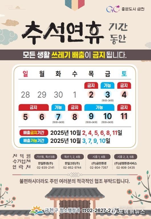 [ 포에버뉴스 김경순 기자 ] 금천구는 추석 연휴 기간 생활쓰레기(일반생활쓰레기, 음식물쓰레기, 재활용품) 수거를 일시 중단한다고 밝혔다.