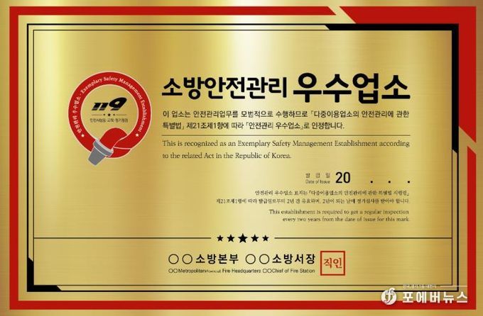 ‘다중이용업소 안전관리 우수업소’ 선정 제도는 영업주의 자율적인 안전관리를 통해 소방안전 문화를 정착시키고, 안전관리에 대한 자긍심을 고취하기 위해 운영되는 제도이다.