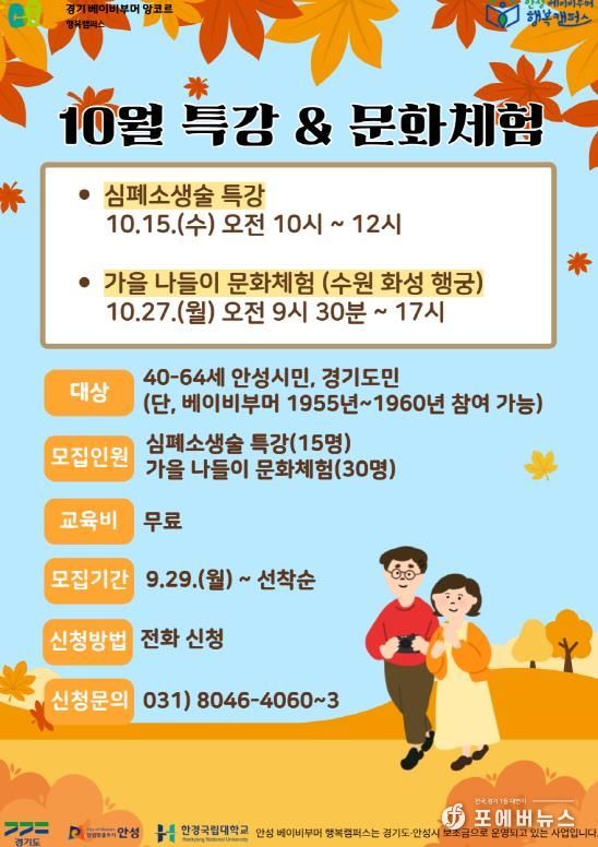 [ 포에버뉴스 김경순 기자 ] 안성 베이비부머 행복캠퍼스(한경국립대학교 평생교육원)는 오는 10월 15일부터 27일까지 중장년 안성시민(경기도민)을 대상으로 ‘10월 특강(심폐소생술) 및 문화체험(수원화성행궁)’ 프로그램을 운영한다고 밝혔다.