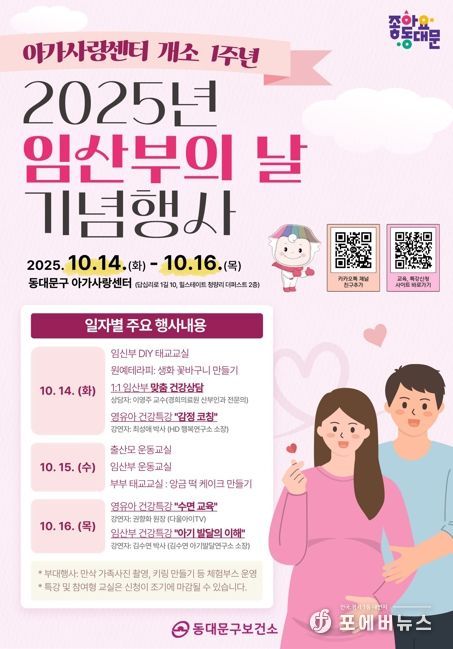 [ 포에버뉴스 김경순 기자 ] 서울 동대문구는 오는 14일부터 16일까지 아가사랑센터 개소 1주년과 ‘2025년 임산부의 날’을 맞아 다양한 기념행사를 개최한다고 밝혔다.