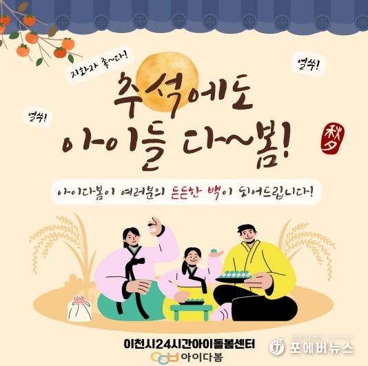 [ 포에버뉴스 박정배 기자 ] 이천시는 추석 연휴 기간에도 이천시 24시간 아이돌봄센터인 ‘아이다봄’을 365일 24시간 정상 운영해 연휴 중 발생할 수 있는 돌봄 공백을 최소화한다고 밝혔다.