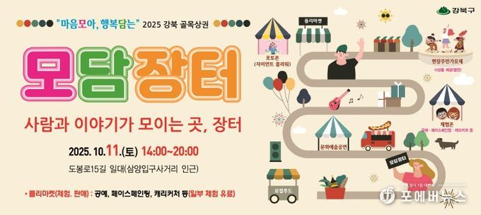 [ 포에버뉴스 김경순 기자 ] 서울 강북구는 오는 11일 오후 2시부터 8시까지 삼양입구사거리 인근 도봉로15길 일대에서 ‘2025 강북 골목상권 모담장터’를 개최한다고 밝혔다.