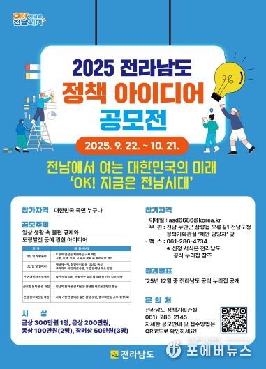 [ 포에버뉴스 오명숙 기자 ] 전라남도가 새 정부의 실용주의 기조에 맞춰 ‘생활 속 불편을 찾고 이를 개선할, 지역의 미래를 먹여 살릴 정책’을 주제로 ‘2025년 전라남도 정책 아이디어 공모전’을 개최한다.