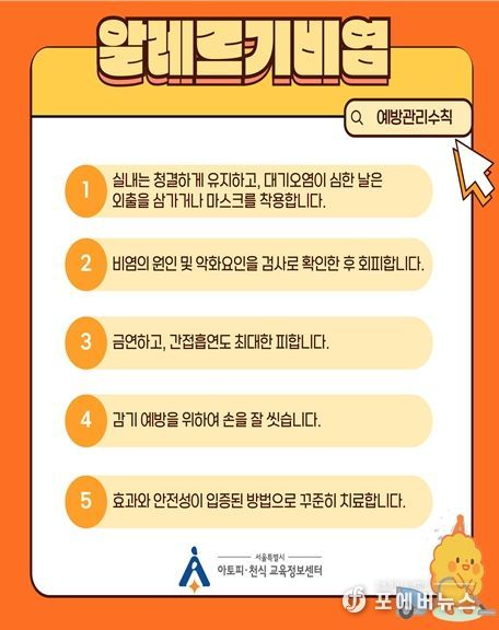 송은철 서울시 감염병관리과장은 “환절기, 특히 가을철에는 알레르기비염 환자가 증가하는 만큼 예방관리 수칙을 꾸준히 실천하고, 센터의 예방 교육에 적극 참여해 건강 피해를 최소화하기 바란다”고 당부했다.