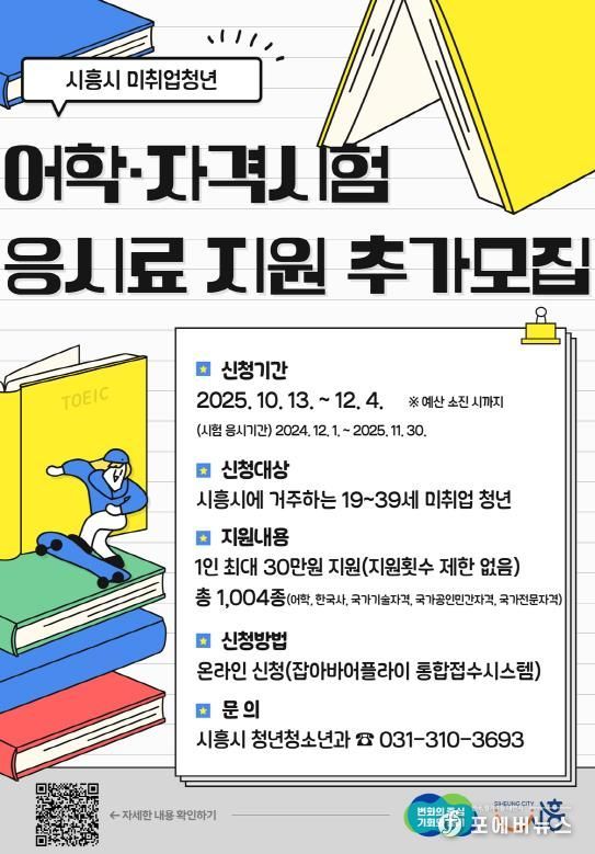 [ 포에버뉴스 김경순 기자 ] 시흥시는 10월 13일부터 관내 취업 준비 청년들의 능력개발을 돕기 위한 어학ㆍ자격시험 응시료 지원 3차 모집을 실시한다.