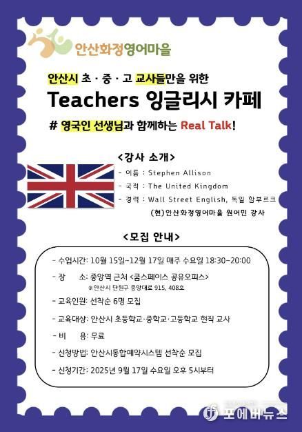 [ 포에버뉴스 김경순 기자 ] 안산시 안산화정영어마을은 오는 15일부터 12월 17일까지 관내 소속 교사를 대상으로 ‘티처스(Teachers) 잉글리시 카페’를 운영한다고 10일 밝혔다.