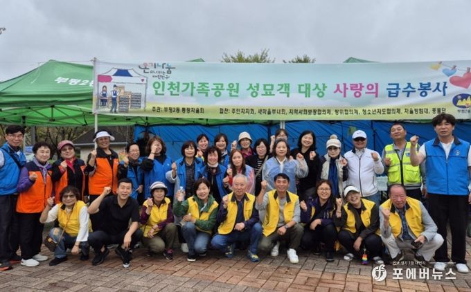 [ 포에버뉴스 김경순 기자 ] 부평구 부평2동 통장자율회는 추석 연휴 기간 인천가족공원을 찾는 성묘객들에게 무료로 인천 하늘수를 나눠주는 봉사활동을 실시했다고 10일 밝혔다.