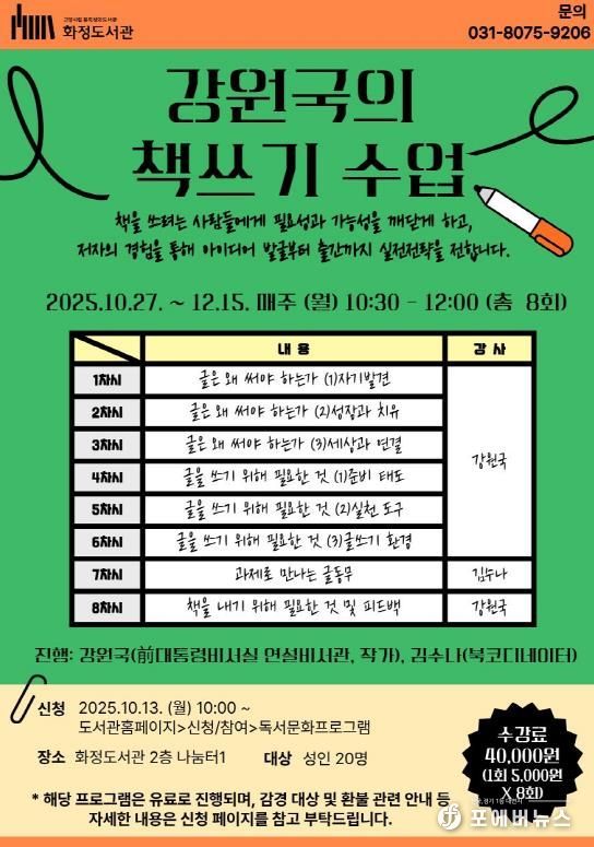[ 포에버뉴스 김경순 기자 ] 고양특례시는 10월 27일부터 12월 15일까지 매주 월요일 오전 10시 30분부터 12시까지, 화정도서관 2층 나눔터1에서 ‘강원국의 책쓰기 수업’프로그램을 운영한다고 밝혔다.