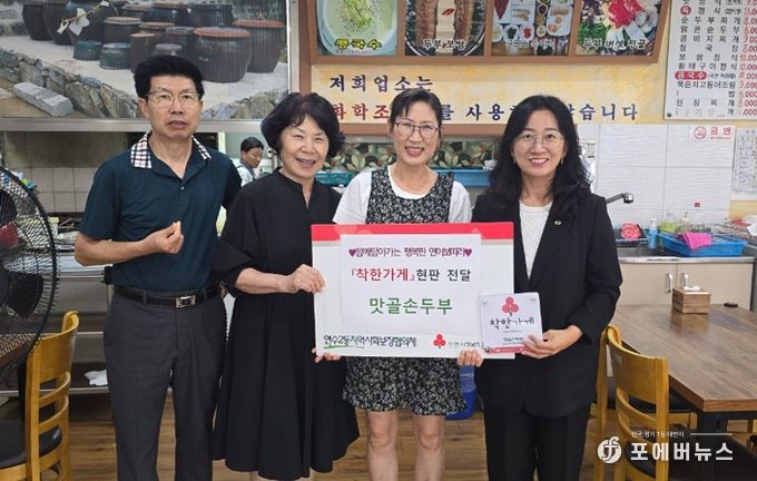 [ 포에버뉴스 김경순 기자 ] 연수구 연수2동 지역사회보장협의체는 지난달 29일 관내 장기요양기관 ‘엔젤복지용구’와 식당 ‘맛골 손두부’에 나눔 인증 ‘착한가게’ 현판을 전달하고 지역사회 나눔 실천에 감사의 뜻을 표했다.