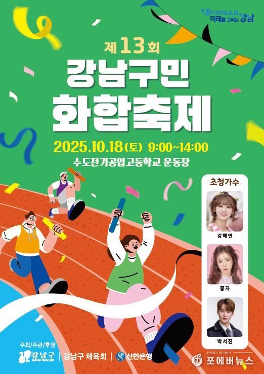 [ 포에버뉴스 김경순 기자 ] 꿈이 모이는 도시, 미래를 그리는 강남구가 오는 10월 18일 오전 9시부터 오후 2시까지 수도전기공업고등학교 운동장에서 ‘제13회 강남구민화합축제’를 개최한다. 구민과 선수단 등 약 7,500명이 참여할 예정이며, 소통과 화합을 바탕으로 건강한 지역사회를 만드는 의미 있는 자리가 될 것으로 기대된다.