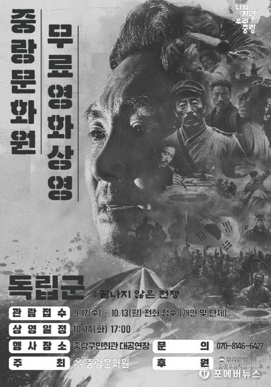 [ 포에버뉴스 김경순 기자 ] 중랑구는 오는 10월 14일 오후 3시와 5시, 중랑구민회관 대공연장에서 광복 80주년을 기념하는 영화 ‘독립군’을 상영한다. 이번 상영회는 중랑문화원이 주최해 선열들의 희생과 숭고한 뜻을 되새기는 특별한 자리로 마련됐다.