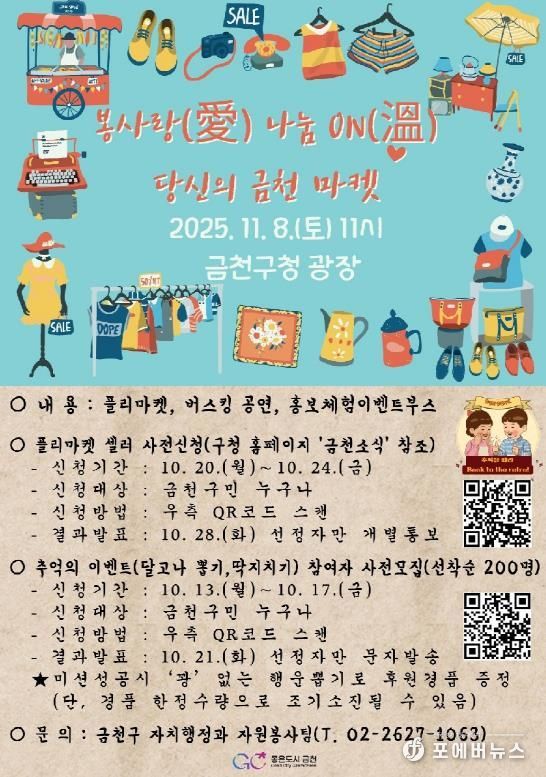 [ 포에버뉴스 김경순 기자 ] 금천구는 오는 11월 8일 금천구청 광장 앞에서 ‘봉사랑(愛) 나눔ON(溫), 당신의 금천마켓’을 연다고 밝혔다.