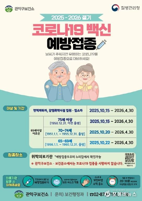 [ 포에버뉴스 김경순 기자 ] 관악구가 호흡기 질환이 증가하는 동절기 대비, 코로나19 감염 고위험군을 대상으로 코로나19 백신 무료 접종을 실시한다.