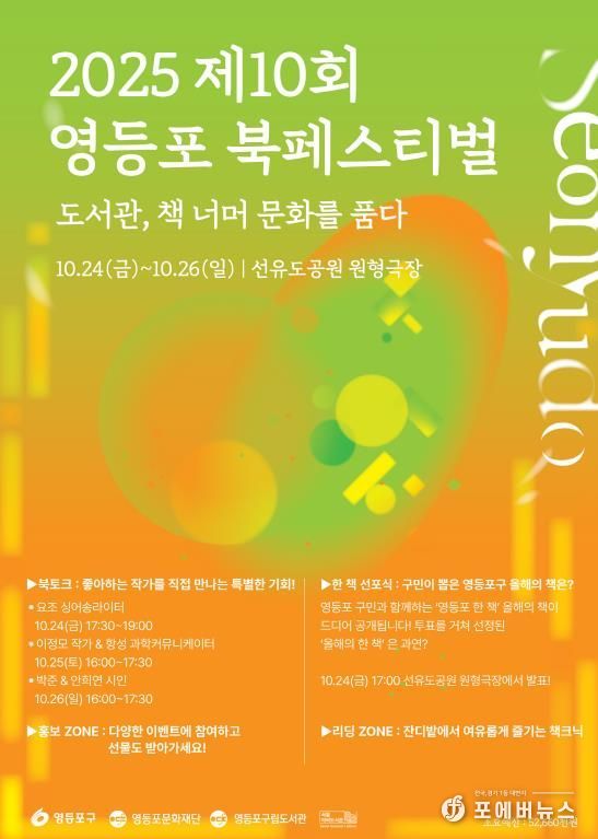 한편 오는 10월 24일부터 26일까지 선유도공원에서 ‘제10회 영등포 북페스티벌’이 열린다. 이번 축제는 영등포 대표 지역축제인 ‘선유도원 축제’와 연계해 진행되며, 선선한 가을 바람 속에서 특별한 독서의 즐거움을 느낄 수 있다. 자세한 사항은 구청 미래교육과 또는 영등포구립도서관으로 문의하면 된다.