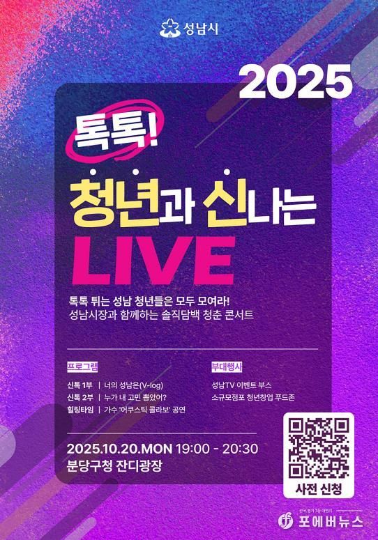 [ 포에버뉴스 김경순 기자 ] 성남시는 청년 세대와의 소통을 강화하고 청년의 목소리를 시정에 반영하기 위해 '톡톡! 청년과 신나는 LIVE'를 오는 10월 20일 오후 7시부터 8시 30분까지 분당구청 앞 잔디광장에서 개최한다.