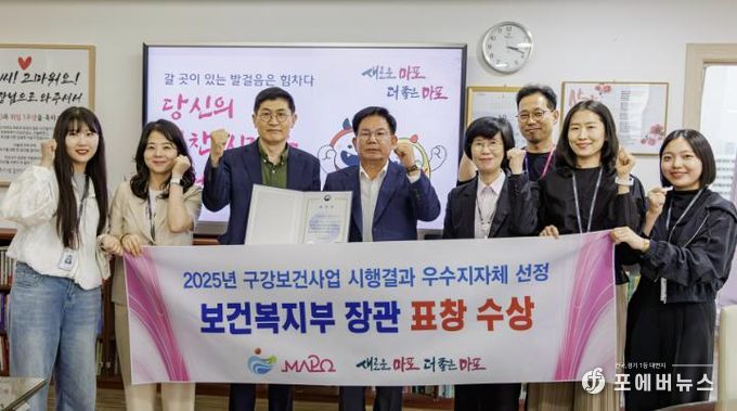 [ 포에버뉴스 김경순 기자 ] 마포구는 지난달 26일, 보건복지부와 한국건강증진개발원이 주관한 ‘2025년 지역사회 구강보건사업 성과대회’에서 우수기관으로 선정돼 보건복지부 장관상을 수상했다.