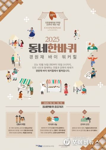 [ 포에버뉴스 김경순 기자 ] 인천경제자유구역청은 오는 14일과 15일 이틀간 경원재 한옥호텔에서 제2회 경원재 시민페스티벌 ‘2025 동네한바퀴 경원재바이워커힐’을 개최한다고 밝혔다.