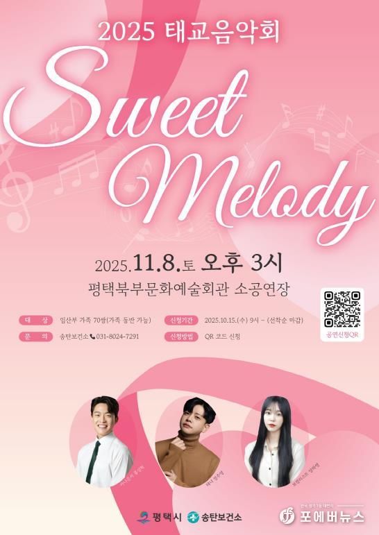 [ 포에버뉴스 김경순 기자 ] 평택시 송탄보건소는 임산부 가족의 정서적 안정과 행복한 출산 환경조성을 위해 오는 11월 8일 ‘2025 태교 음악회『Sweet Melody』’를 개최한다.