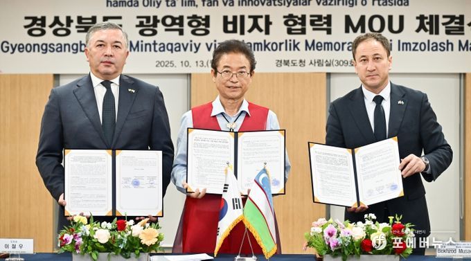 [ 포에버뉴스 사공선 기자 ] 경상북도는 13일 도청 사림실에서 이철우 경상북도지사, 우즈베키스탄 베흐조드 무사예프 대외 노동청장, 타히르존 사파로브 대통령실 담당관 등이 참석한 가운데, 우즈베키스탄 대외 노동청 및 고등교육과학혁신부와 ‘경상북도 광역형 비자 업무협약’을 체결했다.