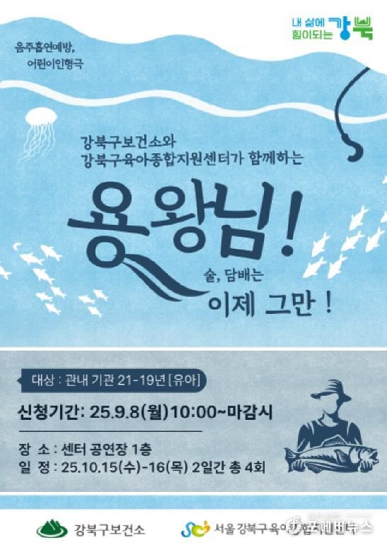 행사는 인수동에 위치한 강북구 육아종합지원센터 1층 공연장에서 진행되며, 오전 10시 20분과 11시 20분 일 2회씩 총 4회 공연으로 구성된다. 인형극 제목은 ‘용왕님 술, 담배는 이제 그만’으로, 술과 담배로 건강을 잃은 용왕님이 자라 경호원과 토끼의 도움으로 금연과 절주의 중요성을 깨닫고 회복하는 이야기다.