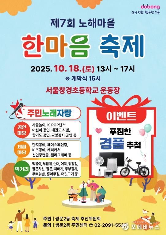 [ 포에버뉴스 김경순 기자 ] 서울 도봉구 쌍문2동이 10월 18일 오후 1시 서울창경초등학교에서 ‘제7회 노해마을 한마음 축제’를 개최한다.