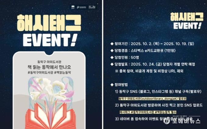 방법은 ▲블로그, 인스타그램 등 구청 공식 SNS 채널 구독 또는 팔로우 ▲야외도서관 방문 ▲자유롭게 책을 읽는 모습이나 현장 촬영 ▲개인 SNS 업로드(해시태그 ‘#동작구 야외도서관 #책 읽는 동작’ 필수) ▲네이버폼을 통한 인증샷 게시물 URL 제출 순으로 하면 된다.