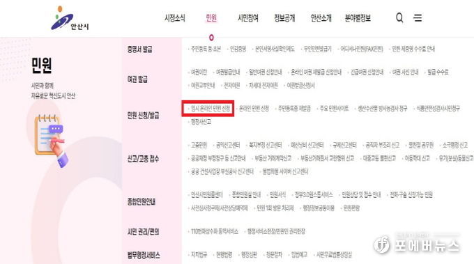 [ 포에버뉴스 김경순 기자 ] 안산시는 지난 13일부터 ‘국민신문고’ 시스템 장애에 대응해 안산시청 누리집에 ‘임시 온라인 민원 신청’ 창구를 설치하고 운영을 시작했다고 14일 밝혔다.