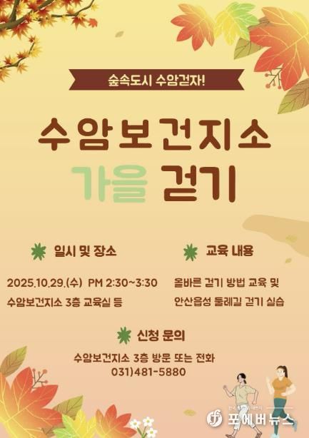 [ 포에버뉴스 김경순 기자 ] 안산시 상록수보건소 수암보건지소는 지역 주민의 건강증진을 도모하기 위해 ‘수암 가을 걷기 교실’ 참가자를 모집한다고 14일 밝혔다.
