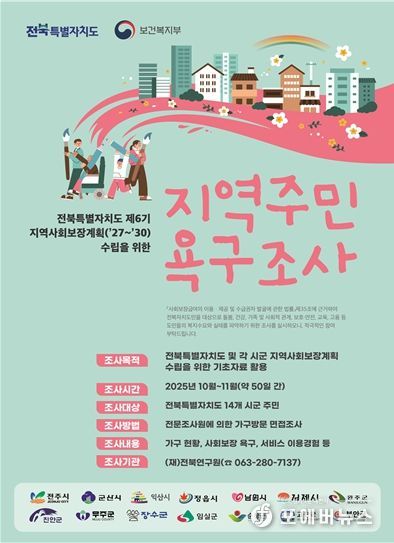 [ 포에버뉴스 이승훈 기자 ] 전북특별자치도가 지역사회 복지 욕구를 체계적으로 파악하고 주민이 체감하는 복지정책을 수립하기 위해 전 도민을 대상으로 지역주민 욕구조사를 실시한다.