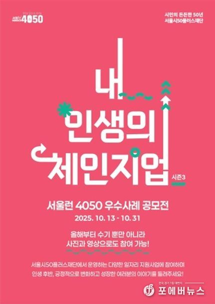 서울시50플러스재단은 10월 13일부터 31일까지 ‘서울런4050’을 통해 성공적인 인생 전환을 경험한 중장년의 이야기를 찾는다고 밝혔다. 기존의 수기 형식 외에 영상, 사진, 웹툰 등 디지털 콘텐츠를 SNS에 게시하는 방식으로도 참여할 수 있다.