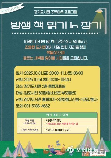 [ 포에버뉴스 김경순 기자 ] 김포시 장기도서관은 주독야독 프로그램인 '밤샘 책 읽기 인(in) 장기'를 10월 31일 오후 8시부터 11월 1일 오전 6시까지 장기도서관에서 진행한다고 밝혔다.
