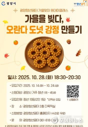 [ 포에버뉴스 오명숙 기자 ] 광양시는 청년들의 여가문화 활성화와 정서적 힐링을 위한 프로그램의 일환으로, 광양청년꿈터에서 가을맞이 원데이클래스 ‘가을을 빚다 – 오란다 도넛 강정 만들기’ 참가자를 모집한다고 14일 밝혔다.