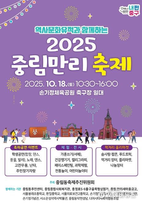 [ 포에버뉴스 김경순 기자 ] 서울 중구는 중림동 손기정체육공원 축구장 일대에서 오는 18일(토) 오전10시부터 오후6시까지‘2025 중림만리 축제’가 열린다고 밝혔다.