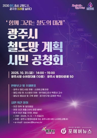 [ 포에버뉴스 김경순 기자 ] 광주시는 오는 31일 오후 2시, 광주시청 수어장대홀(10층)에서 ‘함께 그리는 철도의 미래’를 주제로 광주시 철도망 계획 시민 공청회를 개최한다.