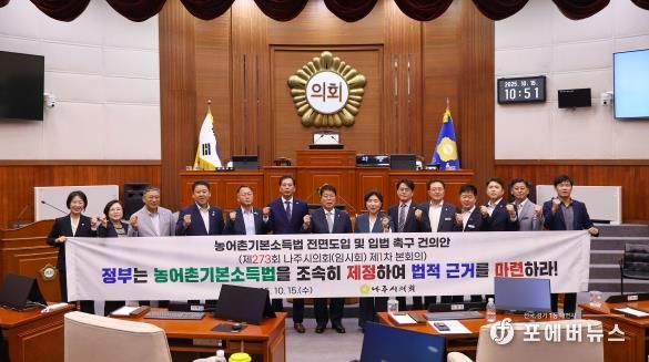 [ 포에버뉴스 오명숙 기자 ] 나주시의회는 15일 제273회 임시회 제1차 본회의를 열고 ‘농어촌기본소득법 전면도입 및 입법 촉구 건의안’을 채택했다.