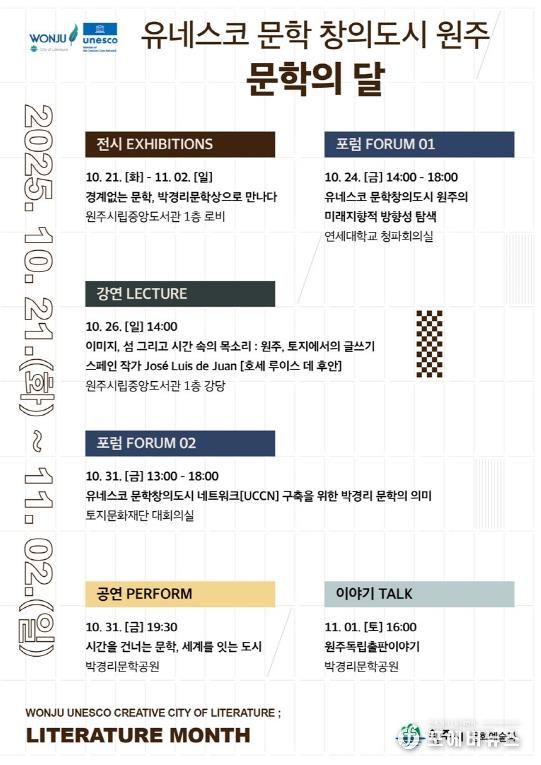 [ 포에버뉴스 방미정 기자 ] ‘유네스코 문학 창의도시 원주’가 오는 10월 21일부터 11월 2일까지 ‘시간을 건너는 문학, 세계를 잇는 도시’를 기치로'2025년 원주 문학의 달'행사를 개최한다.