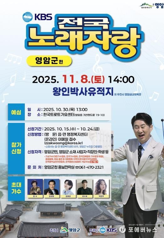 영암군 주최, KBS 주관으로 11/8일 오후 2시 왕인박사유적지에서 열리는 전국노래자랑에서 솜씨를 뽐낼 영암군민 등의 신청을 받는다.