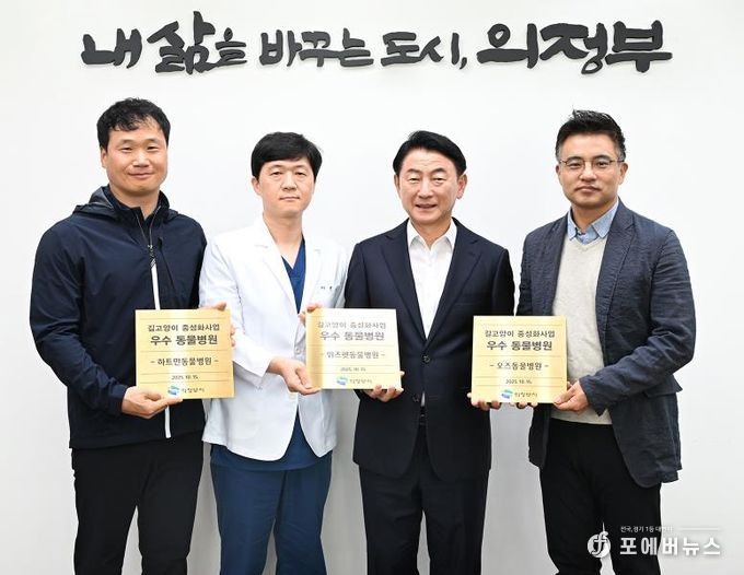 [ 포에버뉴스 김경순 기자 ] 의정부시는 10월 15일 시장실에서 ‘길고양이 중성화사업 우수 동물병원’ 인증패 전달식을 열고, 사업에 적극 참여해 지역 동물복지 문화 확산에 기여한 동물병원을 격려했다.