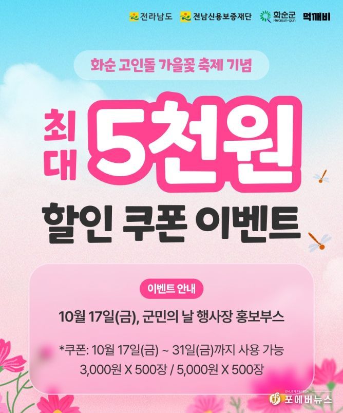 [ 포에버뉴스 오명숙 기자 ] 화순군은 오는 10월 17일 제44회 화순군민의 날 행사장에서 2025 화순 고인돌 가을꽃 축제 기념 공공배달앱 ‘먹깨비’ 이벤트를 진행한다고 밝혔다.