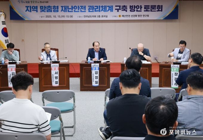 [ 포에버뉴스 오명숙 기자 ] 전라남도의회 의원 연구단체인'재난안전 선진화 방안 연구회'는 지난 10월 15일 전라남도의회 초의실에서 강정일 대표의원(광양2) 주재로 ‘지역 맞춤형 재난안전 관리체계 구축 방안’에 대한 토론회를 개최했다.