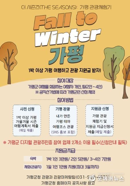 [ 포에버뉴스 김경순 기자 ] 가평군은 가을과 겨울철 지역관광 활성화를 위해 체류형 관광객에게 숙박비와 체험비를 지원하는 ‘더 시즌즈(The Seasons) 행사를 추진한다고 17일 밝혔다.