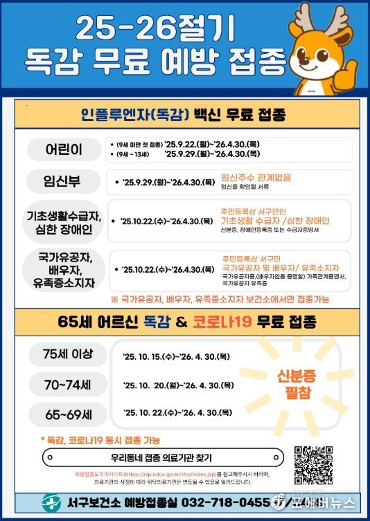 [ 포에버뉴스 김경순 기자 ] 인천 서구는 지난 15일부터 65세 이상 어르신을 대상으로 2025~2026절기 인플루엔자(독감) 무료 예방접종을 시작했다.
