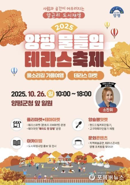 [ 포에버뉴스 박정배 기자 ] 양평군은 오는 10월 26일, 양평군청 앞 특설무대 및 주차장 일원에서 ‘2025 양평 물들임 테라스 축제’를 개최한다고 밝혔다.