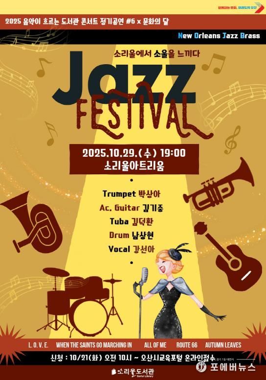 [ 포에버뉴스 김경순 기자 ] 경기도 오산시는 오는 10월 29일 오후 7시, 소리울도서관 3층 소리울아트리움에서 '2025 음악이 흐르는 도서관 콘서트 정기공연 #6 × 문화의 달 – Jazz Festival; 소리울에서 소울을 느끼다'를 개최한다고 밝혔다.