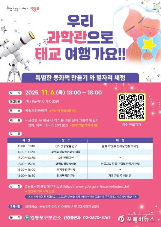 [ 포에버뉴스 김경순 기자 ] 영등포구가 예비 부모와 태아가 함께 교감하는 특별 체험 프로그램 ‘과천과학관 태교 여행’ 참여자를 모집한다고 밝혔다.